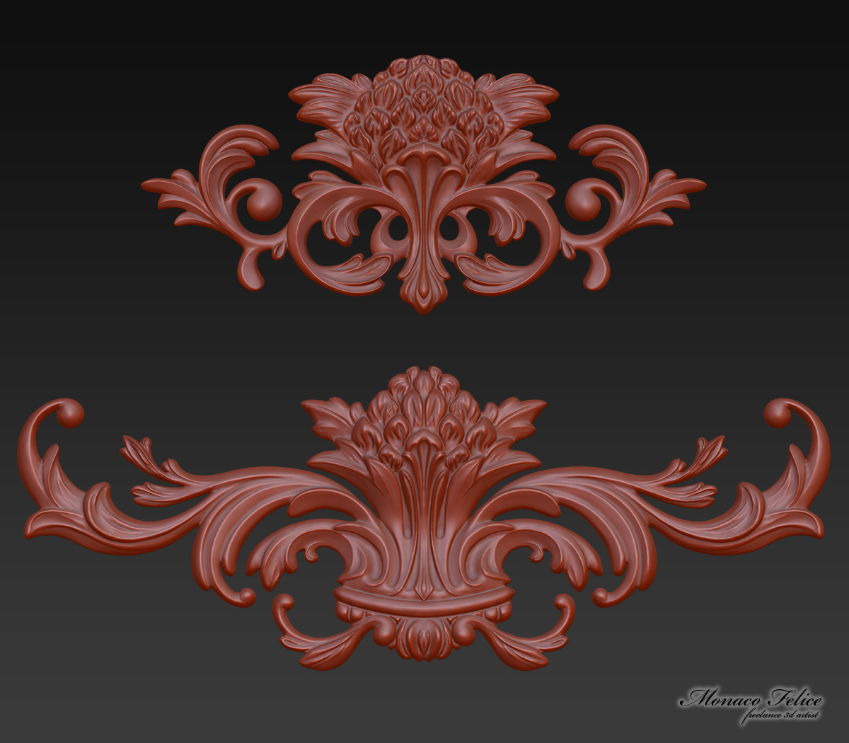 А вот и новенькое :) Да-да, начну обновления именно с новинок. Сегодня наконец-то закончил работу над 3D скульптингом декоративных элементов мебели. Модель создавалась под резку на фрезере для последующего создания формы и литья изделия. (Сама мебель будет немножко позже.) Почему "наконец-то"? :) - дело в том, что эта работа была для меня чем-то совершенно новым, отличным от того, чем я занимался раньше, поэтому пришлось изучать много новых инструментов, провести огромное количество экспериментов, пересмотреть десятки часов видео-туторов ...и как раз на этой работе я изучал ZBrush :) Признаюсь, раньше меня повергала в небольшой шок необходимость моделировать сложные ажурные рамы зеркал или картин, кованные декоративные элементы или резную классическую мебель ...что лукавить, подобные работы очень сложны в моделинге и требуют высокого мастерства моделлера вместе с усидчивостью и большим количеством времени (а учитывая тот факт, что нашим заказчикам надо всё очень быстро и очень дёшево (как обычно, уже на вчера), то присутствие подобных сложных элементов в проекте иногда вызывает депрессивные состояния :) ). Но сегодня я спокойно смотрю на такие работы, и сегодня я абсолютно уверенно могу сказать, что теперь я тоже умею моделить сложные, даже очень сложные декоративные элементы! И кроме того, эта работа открыла во мне новые пристрастия в 3D графике - я полюбил 3D скульптинг! Если раньше я просто с восхищением смотрел на работы ZBrush-художников, даже не представляя, в своей тогдашней унылой работе над арх-визом, где эти прекрасные модели можно применить, то теперь я это знаю, теперь я сам создаю подобные модели. При чём, признаться, никогда раньше 3D моделирование не приносило мне столько удовольствия и не давало такой свободы в работе, как "лепка" модели, подобно настоящему скульптору превращающему бесформенный кусок глины в произведение искусства.
